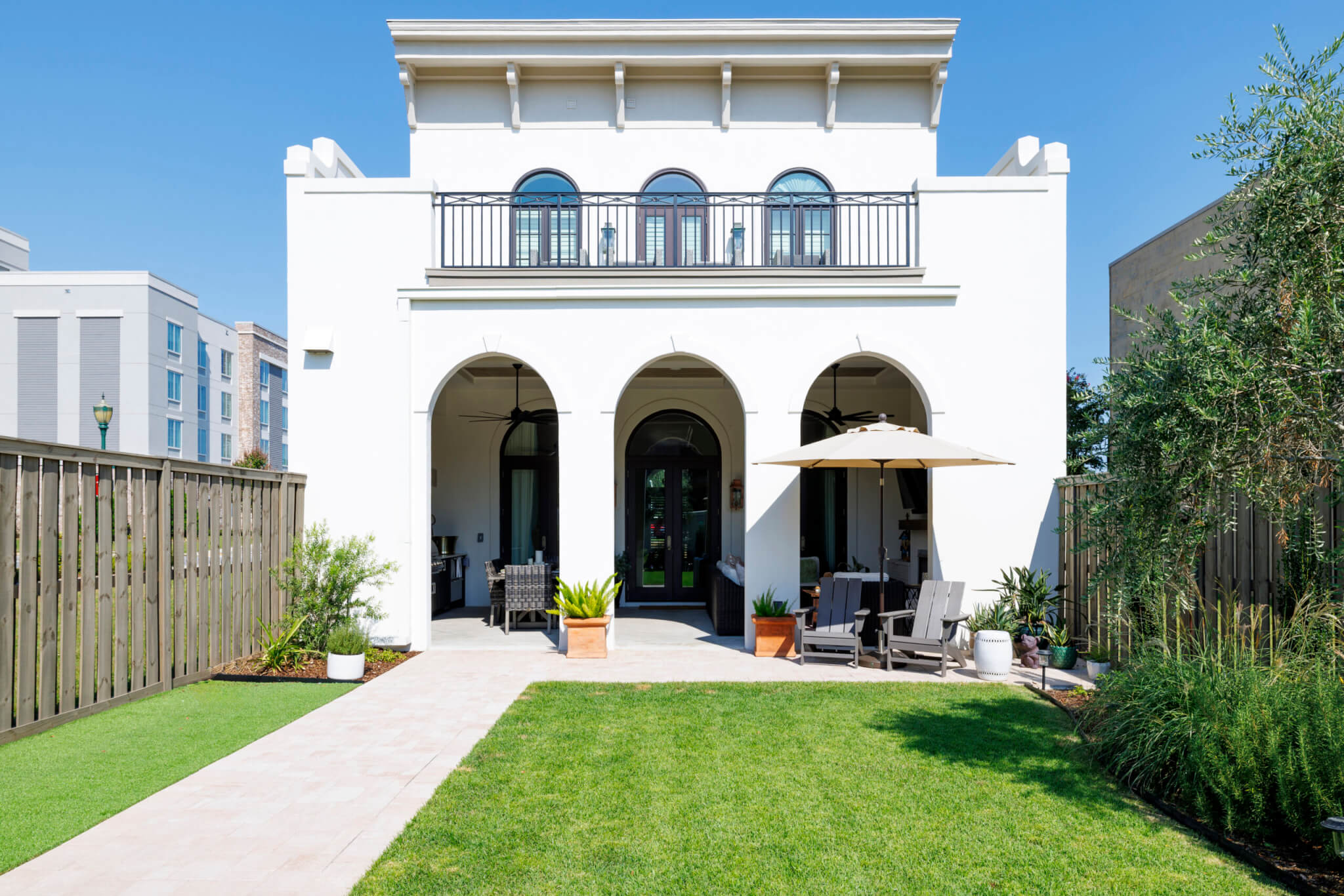 The image captures the striking rear façade of a two-story residential home. The white stucco exterior is accented by three large arched openings on the ground floor, leading to a covered patio. The second story features a wrought-iron balcony with three matching arched windows. A well-maintained lawn and a light-colored stone pathway lead from the patio to the back of the property, which is bordered by a wooden fence. Outdoor furniture is visible on the patio, including a dining set and lounge chairs under a sun umbrella. The overall scene conveys a serene and inviting outdoor living space.