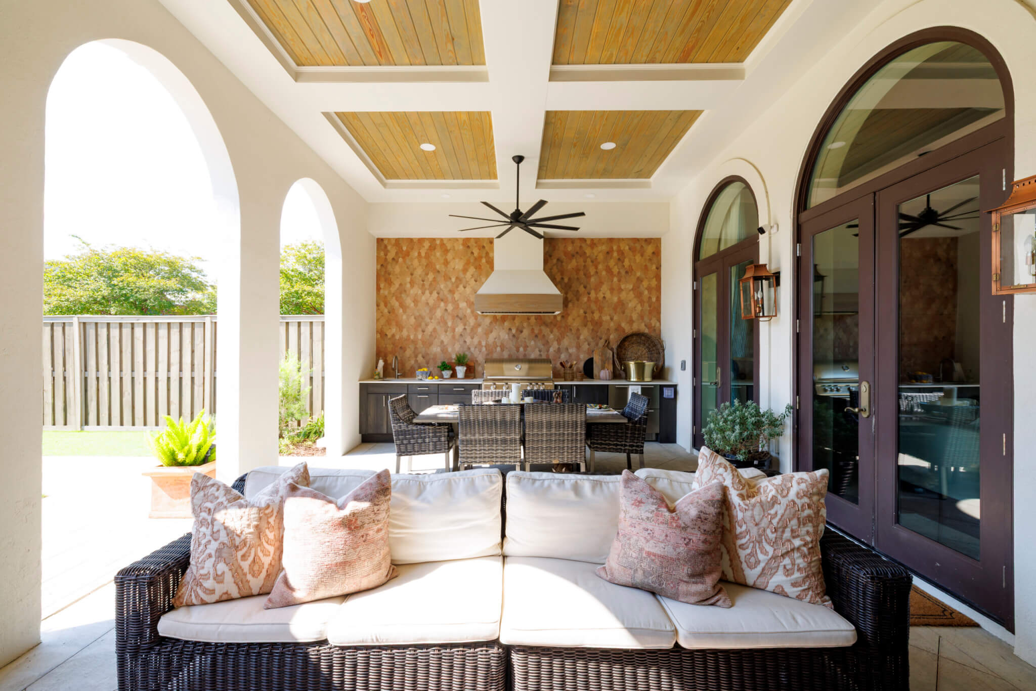 The image captures a stylish and functional covered patio space. In the foreground, a dark wicker sofa with plush white and patterned pillows offers a comfortable lounge area. Beyond the sofa is a wooden dining table with wicker chairs, situated in front of a modern outdoor kitchen. The kitchen features dark cabinetry, a built-in stainless steel grill, a sink, and a striking backsplash of hexagonal, terracotta-colored tiles. A white and wood-trimmed range hood hangs above the grill. The ceiling is a standout feature with its white coffered design and recessed wood panels. Large arched openings frame the space, offering a glimpse of the lush green backyard.