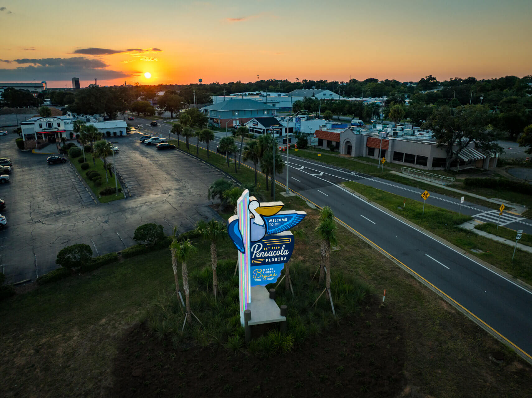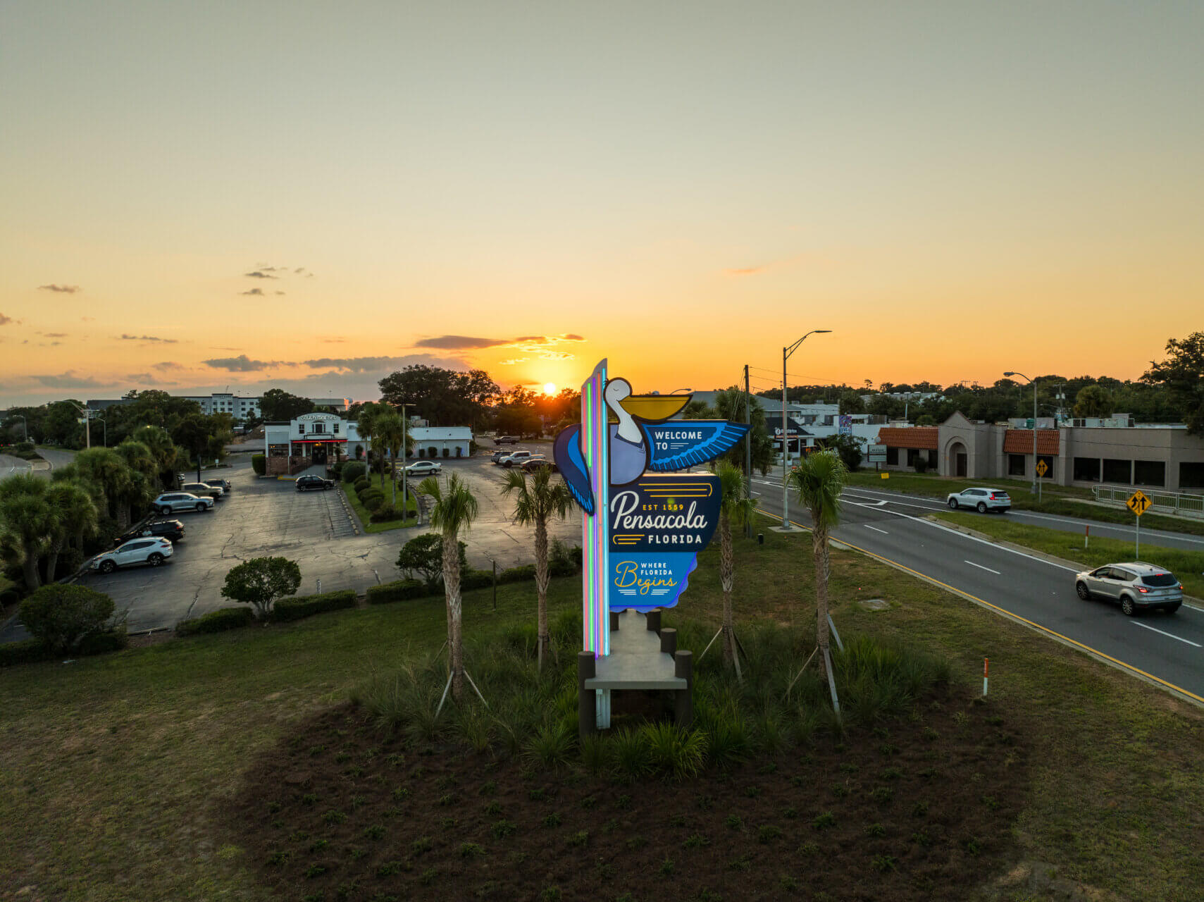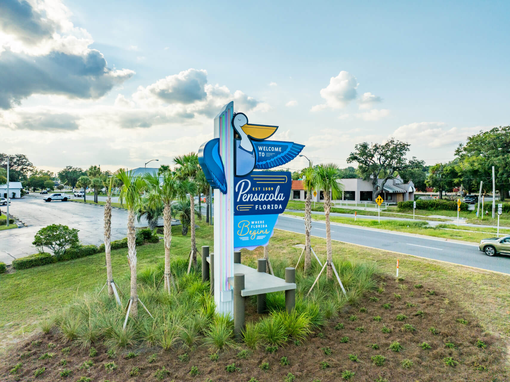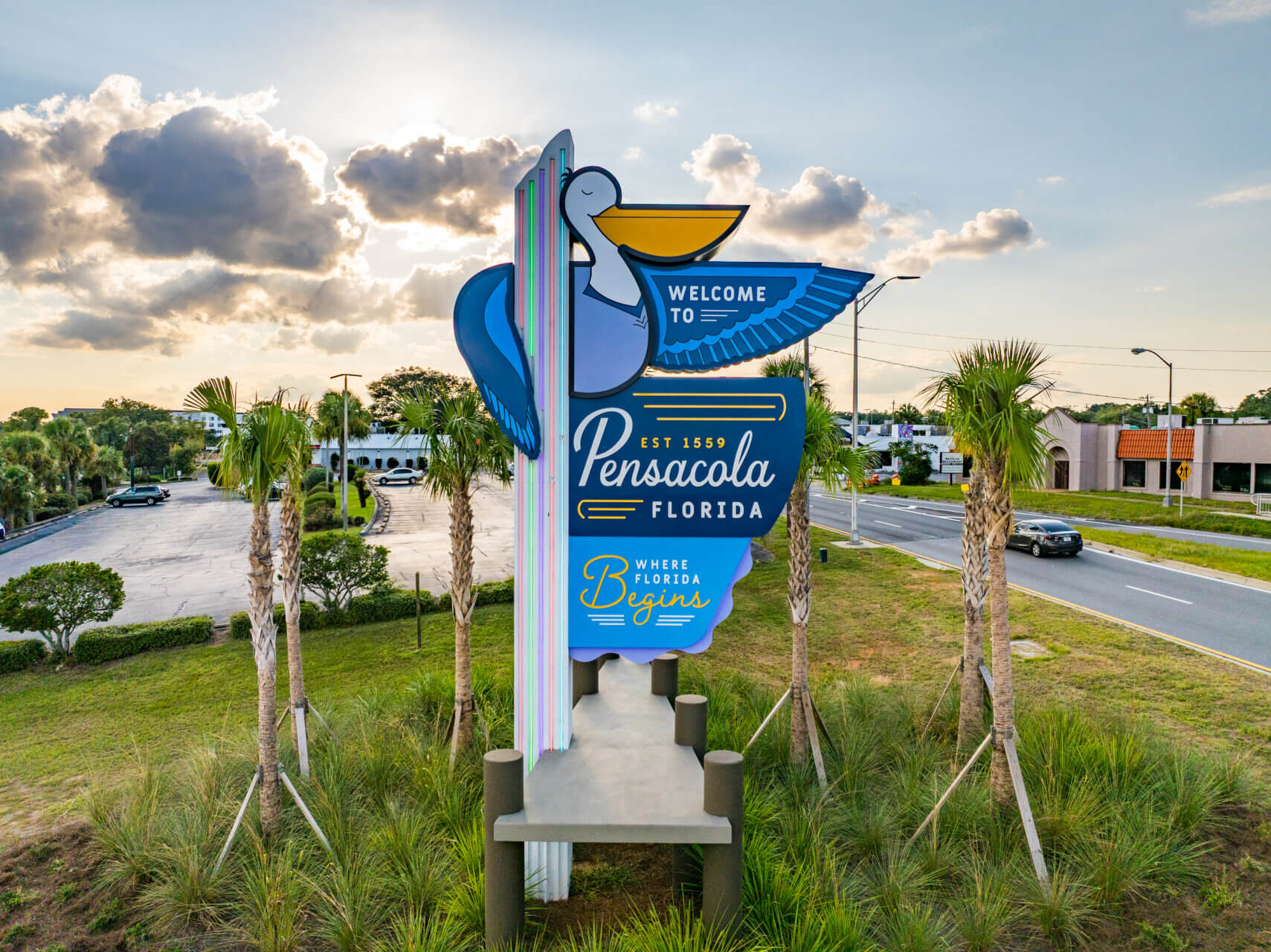 A bright, sunny day highlights the welcoming Pensacola sign and its iconic pelican design.