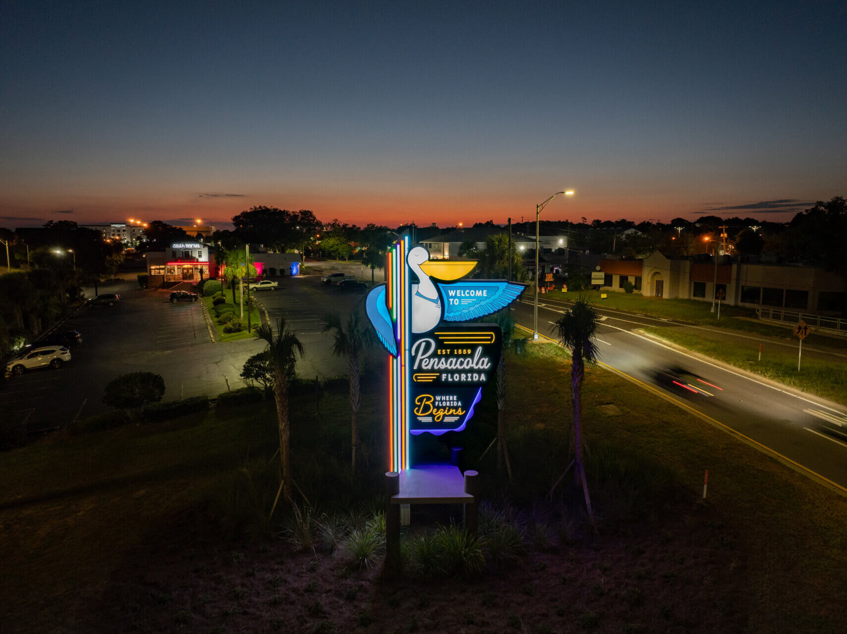 The Pensacola welcome sign at twilight, as its colorful neon lights begin to glow, marking the transition from day to night.