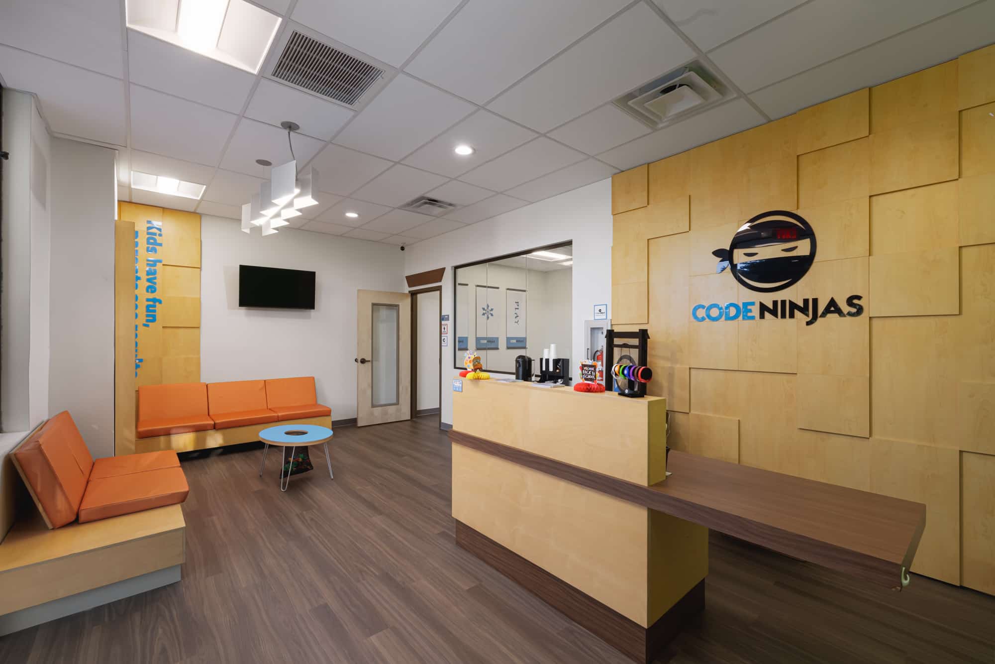 This view captures the dedicated Parent Waiting Lounge. The design uses built-in, custom wood benches with comfortable bright orange upholstery. A prominent wooden display column, featuring the Code Ninjas ‘Belt System’ graphic, reinforces the brand’s gamified learning structure. A wall-mounted TV and large exterior windows complete the bright, transparent, and comfortable waiting environment.