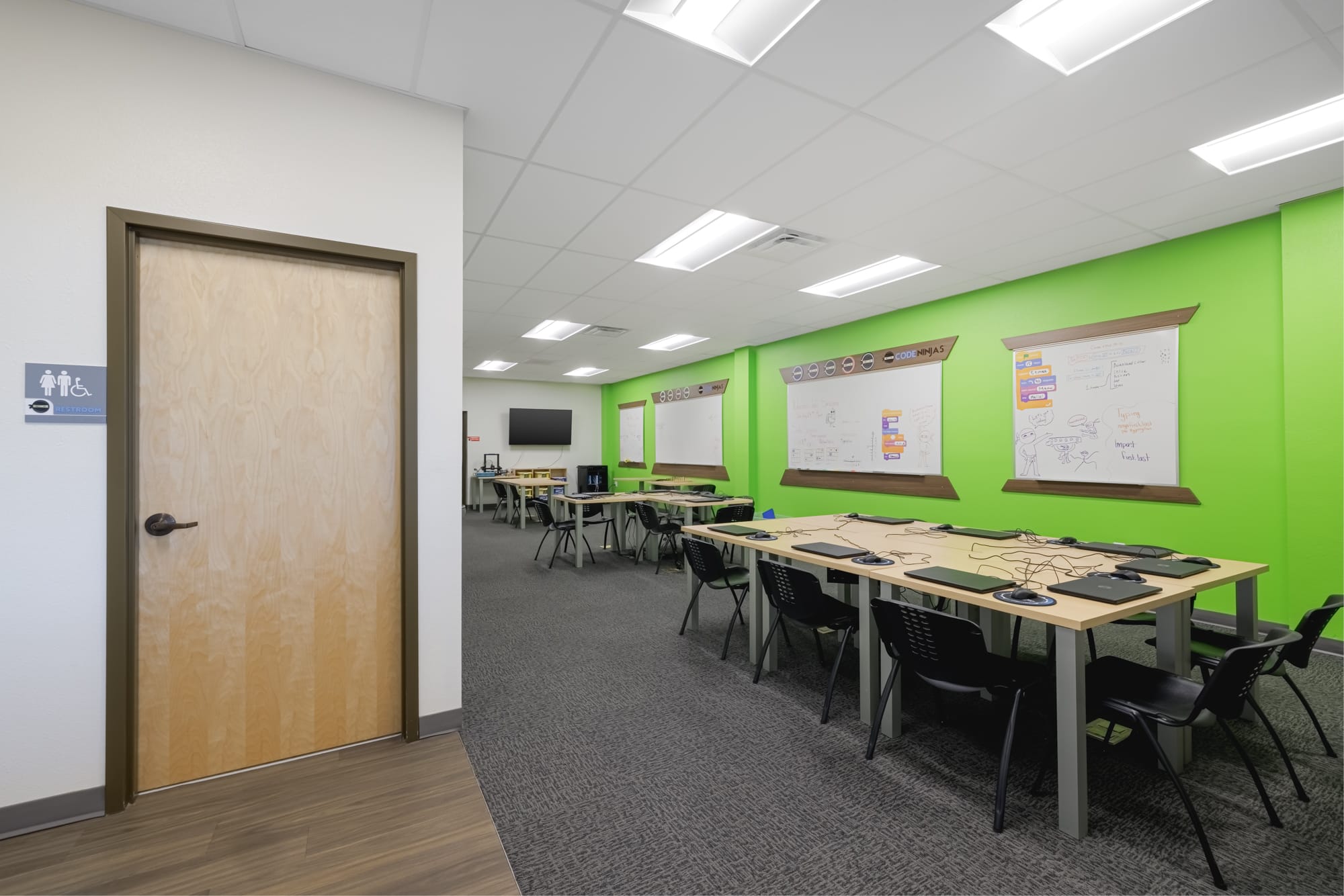 This image provides a clear side view of the Dojo’s flexible layout, showcasing how the tables can be moved to accommodate different class sizes and activities. It also shows the continuity of the design, with the light wood door and clean white wall treatment transitioning seamlessly from the lobby area into the learning space.